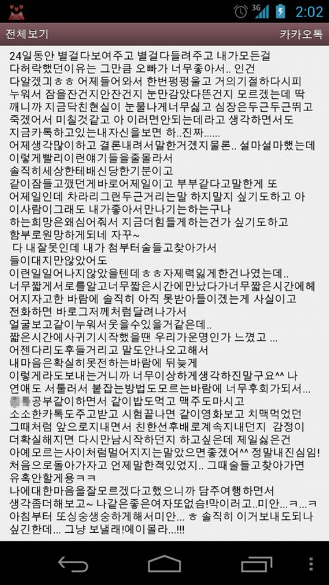 거의 한시간을 넘게 생각하면서 오빠에게 마지막으로 장문의 카톡을 보냈어요