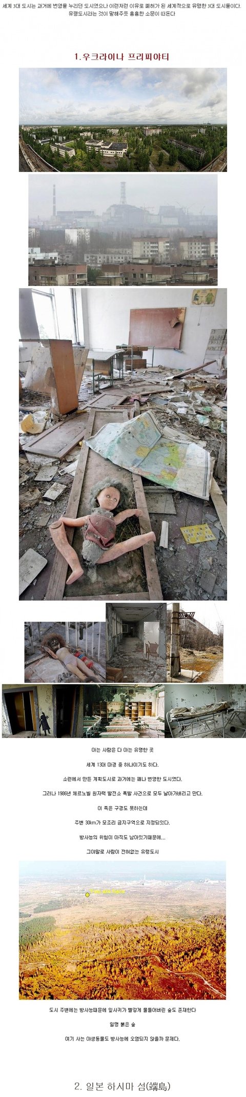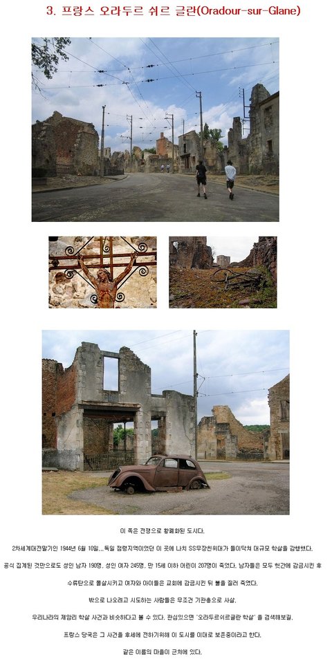 세계 3대 도시는 과거에 번영을 누리던 도시였으나 이런저런 이유로 폐허가 된 세계적으로 유명한 3대 도시들이 유령도시라는 것이 말해주듯 흉흉한 소문이 떠돈다1. 우크라이나 프리피야티아는 사람은 다 아는 유명한 곳세계 13대 마경 중 하나이기도 하다.소련에서 만든 계획도시로 과거에는 꽤나 번영한 도시였다.그러나 1986년 체르노빌 원자력 발전소 폭발사건으로 모두 날아가버리고 만다.이 쪽은 구경도 못하는데 주변30km가 모조리 금지구역으로 지정되있다.방사능의 위험이 아직도 남아있기때문에...그야말로 사람이 전혀없는 유령도시도시주변에는 방사능떄문에 잎사귀가 빨갛게 물들어버린 숲도 존재한다일명 붉은 숲여기사는 야생동물도 방사늘에 오염되지 않을까 문제다. 2.일본 하시마 섬예전에 광업도시로 일본의 근대화를 이끌던 곳이였으나석유의 등장으로 석탄의 필요성이 줄어들어 광이 폐광된 후에 주민들이 하나둘 떠나기 시작했으며 3개월후에 모든 주민이 떠났다아무도 살지 않지만 그때의 모습은 그대로 남아있어 분위기가 으스스하다.사람들이 견학도 한다. 물론 지정된 장소이외는 출입금지. 붕괴의 위험이있다.섬에 오래 머물러있는것이 금지되있다.MBC 서프라이즈에도 소개됬다고한다.세계문화유산으로 지정될지도 모른다고(?!)한국사람도 여기 끌려가서 많이 죽었다.'지옥섬'이라고 불렀다고한다. 3 프랑스 오라두르 쉬르 글란이쪽은 전쟁으로 황폐화된 도시다.2차세계대전말기인 1944년 6월 10일...독일 점령지역이었던 이 곳에 나치 SS무장 친위대가 들이닥쳐 대규모학살공식 집계된 것만으로도 성인 남자 190명, 성인여자 245명, 만15세 이하 어린이 207명이 죽었다. 남자들은 모두 헛(짤림)수류탄으로 몰살시키고 여자와 아이들은 교회에 감금시킨뒤 불을질러죽였다.밖으로 나오려고 시도하는 사람들은 무조건 기관총으로 사살.우리나라의 제암리 학살 사건과 비슷하다고 볼수있다. 관심있으면'오라두르쉬르글란 학살'을 검색프랑스 당국은 그 사건을 후세에 전하기위해 이도시를 이대로 보존중이라고 한다.같은이름의 마을이 근처에있다. -------------------------------------------------------------------- 힘드네요...베플점ㅋㅋㅋㅋ