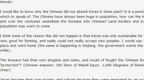 반도이고 과거에는 대단히 고립되어 있었잖아. 말하자면 다른 동맹국도 없이 말야. 중국인들은 인구도 항상 큰 규모였는데 어째서 한족은 그냥