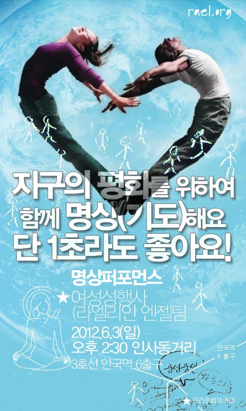 인류의 창조자 우주인 엘로힘의 사랑과 평화의 메시지를 전하는 한국 라엘리안 무브먼트(대표 정윤표)가 오는 6월 3일(일요일) 오후 2시30분부터 3시30분까지 서울 인사동 문화의 거리에서 ‘명상(meditation)’을 고취하는 이색 퍼레이드를 벌인다.