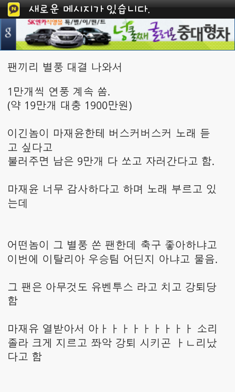 설명해드리겠습니다 마재윤은 승부조작 파문으로인하여 프로게이머생활망하고 아프리카bj로 별풍선(1개 100원)으로 먹고살고있는데 팬들끼리 경쟁붙어가지고 10만개를쐈습니다(약 1천만원) 그리고 10만개쏜애가 버스커버스커노래불러주면 9만개 더쏘고 자러간다고했는데 어떤애★ 가 별풍쏜다는 A 에게 이탈리아 우승팀 누구냐고물어봐서 아무것도 모르고 유벤투스(마찬가지로 승부조작팀 - 마재윤 승부조작을 연상시키므로 금지어 - 바로강퇴됨) 라고 말한 별 10만개를 쏜 A 가 강퇴당해 나머지 별 9만개를 받지못한 마재윤의 맨붕 된 사건이죠