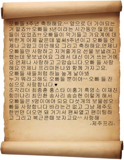 오빠들 5주년 축하해 선물 보낸다는걸 깜박해서 미안하고 나중에 잘챙겨줄게 오원빈오빠도 축하 하고 나갔지만 영원한 에프티아일랜드야 사랑해 그리고 미안해 못챙겨줘서 오빠들은 우리에게 해준게 많은데 우리는 조금 밖에 못해준것같아 오빠들 사랑해 그리고 축하해 쭉 평생가자