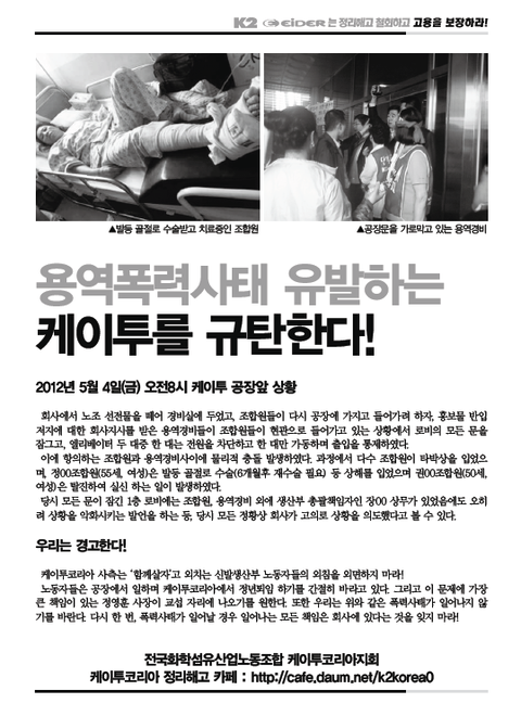 다음카페 http://cafe.daum.net/k2korea0/ (k2코리아 정리해고 공식카페)