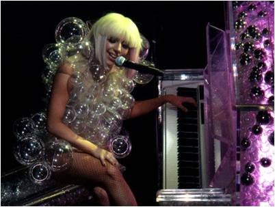 다음, 레이디가가의 이 비눗방울옷은 팬들에게 즐거운 충격을 준 옷입니다. Bubble, Bubbly란 단어는 비눗방울이라는 뜻이 있지만 명랑, 쾌할한 이라는 뜻도 있습니다. 그녀는 이 옷을 후세인 샬라얀의 옷을 보고 영감받아 제작한 옷이라 했으며 기쁜 순간(Bubble Moments)를 표현하고자 하였습니다.