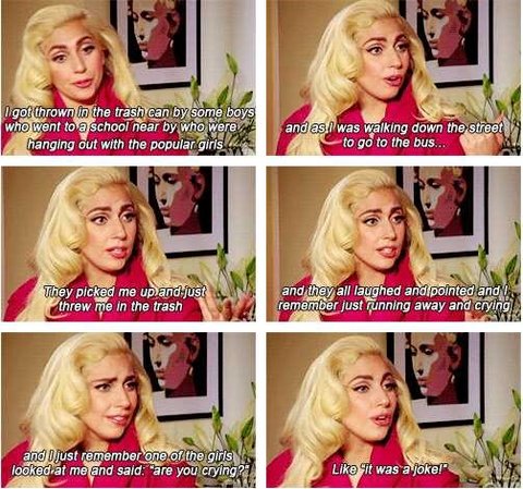 “내가 아침에 일어났을때, 나는 다른 여느 24세의 여자들이랑 똑같이 느껴요. 그리고선 나는 말하죠,“이년아, 넌 레이디가가야. 넌 일어나서 오늘도 걷고 또 걸어야해”라고”