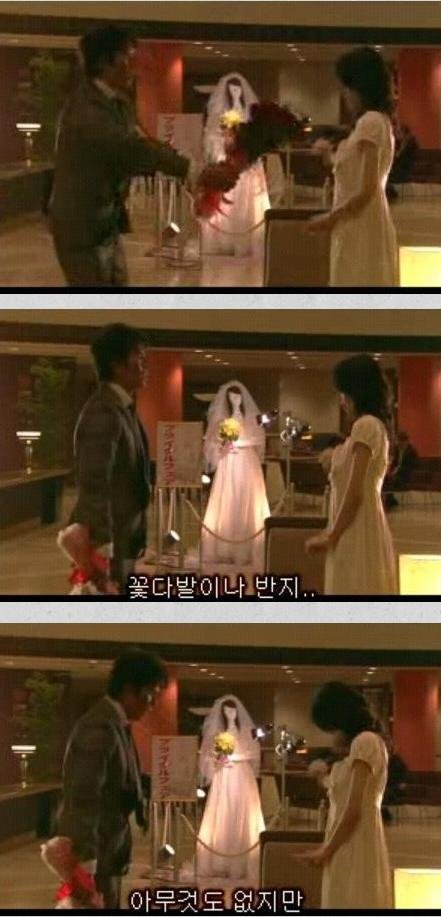 꽃다발을 내밀려다 꼬마아이를 구하려다 엉망이 되어 다시 집어넣고 '꽃이나 반지 아무것도 없지만'