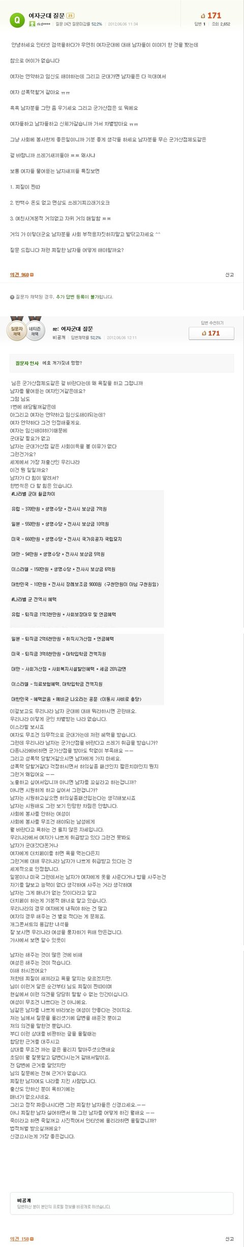 아진짜 ㅋㅋ 개념없네 이제전역 한달도 체 안남은사람으로서 진짜 뭐같다 이런글 볼때마다 남자 군대짧다 ,더늘려야한다 ,월급인상은 뭣하러하냐 라는 개념없는소리하지마라 시급으로 따지면 한시간에 200원도 안되는 돈 받으면서 하루왠종일 일해봤냐? 없겠지 ㅋㅋ 최소 4천원씩은 받았겠지 누군 하고싶어서 여기와서 내 인생에 한번밖에 없는 20대 초반 그 청춘을 여기에 투자하고있냐? 너네 화장품 옷에 투자할때 이제 성인으로 사회 첫발이라 할수있는걸 의무적으로 우리나라를 지키는 남자들한테 뭐? 발딲고 자세요? ㅋㅋㅋㅋ웃껴서 할말이 없다 진짜 ㅋㅋㅋㅋㅋ 니네 임신하기싫음 안하지? . 그럼 우리도 군대가기싫음 안가게해주던가 ㅋㅋ 다른나라에 비교도 안될정도의 혜택인데 그거하나에도 태클을 거냐? ㅋㅋ이래서 중고등학생때 남자머리만 짧게 하는게아니라 여자들도 밀어야되 똑같이 바지입고 똑같이 일하고 똑같은 대우받고 지내봐야 아 씨1발 뭐같구나 ㅋㅋ하지 남자가 신체가 더 뛰어나지? 그래 니넨 머리로하는게 더 뛰어다며 ㅋㅋ 대학이나 회사들어갈때 왜 그럼 ㅋㅋ 남자뽑을때 가산점좀 처주지그러냐. 니네 체력 연연하지마라 똑같은사람이다 ㅡㅡ열받게 시리 -------------------------------------------------------------------------- 어머.. 휴가전날에 열받아서 쓴글이 올라가다니...ㅋㅋ 감사합니다 ㅋ(별로한것 없지만 서도) p.s (백지영 신곡인가? 사랑은독해~ 나원래 독해~ 뭐이런노래있잖아요 제가 가수 백지영을 싫어하는게아니라 그냥 그노래가 싫드라고요 mv보면 강아지나오고하는데 가사 도 듣다보니까 ㅡㅡ 개에 비유했고 거참.. 여성부에서는 조리퐁이나 이딴 애들먹는 과자도 태클인데 남성부는 뭐하나.. 아니 있긴한가.. ) 오냐오냐 했더니~ 잘한다 잘한다 했더니~ ㅡㅡ 우쭈쭈 밥먹자~ ...이건뭐