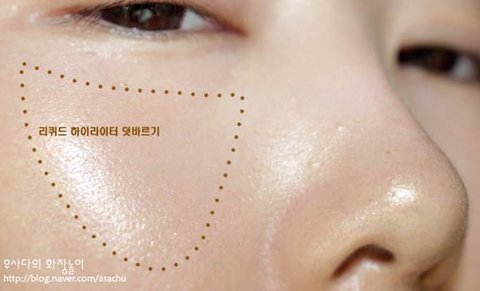 스킨케어 후 T존과 광대에 리퀴드 하이라이터 쏘 고저스를 얇게 발라 준 뒤