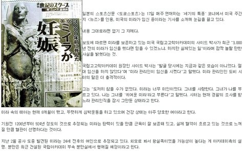 에이 말이안되지 ㅋㅋ 미라는 이미 죽었고 탱탱하게 보관됫다고해도 미라는 자궁의 역활을 못하지 그리고 그 뱃속에 아기는 멀먹고 살지? ㅋㅋㅋㅋㅋㅋ 미라는 아무것도 안먹는데 재밌는기사넹
