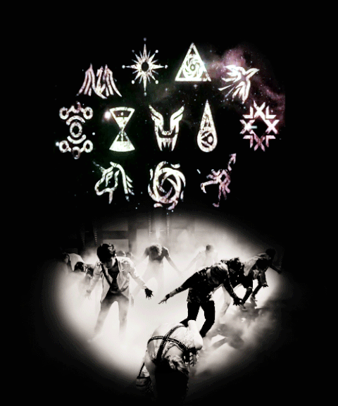 디오군의 문양을 중심으로 왼쪽은 시간조절, 염력, 비행, 빛, 치유, 텔레포트