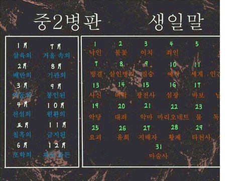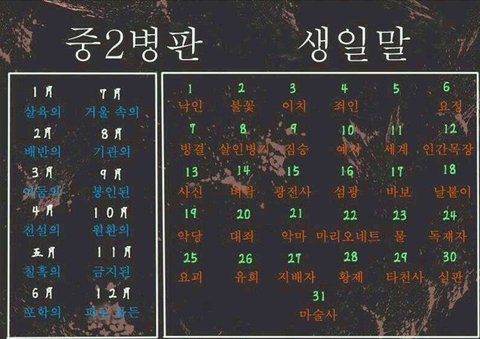 모바일배려╋짤린거원본 거울속의 악마..?ㅠㅠ 1월-살육의 2월-배반의 3월-어둠의 4월-전설의 5월-칠흑의 6월-포학의 7월-거울의 8월-기관의 9월-봉인된 10월-원환의 11월-금지된 12월-피로 물든 1일-낙인 2-불꽃 3-이치 4-죄인 5-X 6-요정 7-빙결 8-살인병기 9-짐승 10-예지 11-세계 12-인간목장 13-사신 14-벼락 15-광전사 16-섬광 17바보 18-날붙이 19-악당 20-대죄 21-악마 22-마리오네트 23-물 24-독재자 25-요괴 26-유희 27-지배자 28-황제 29-타천사 30-심판 31-마술사