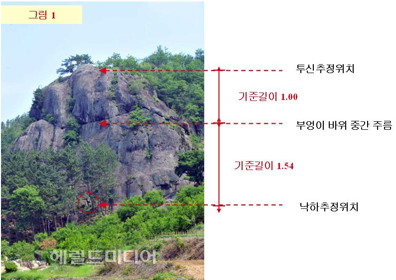 그림1) 부엉이 바위 그림이다 중간에 바위 상단과 바위 하단이 보이고 기자양반이 사진찍을때 누군가 검시하는듯한 인간이 보인다. 대략 추정 추락위치 정도로 보면 무리는 없을 것같다. 중간 바위 갈라진 기준으로해서 상단 기준길이를 1.0으로 했을때, 하단 추락지점까지 길이는 대략 그 1.5배정도 된다.