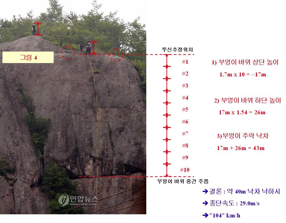 그 림 1)에서 보았듯이 위아래 높이를 기준으로 계산해보면 투신지점으로부터 추락지점까지의 높이는 보수적으로 잡아도 근 43m, 맨처음에 언론에서 바위 높이를 3~40미터라고 하다가 나중엔 30m로 바뀌던데 이게 10m차이가 이게 단순한 차이가 아니다. 40미터는 30미터에서 추락할때보다 받는 충격 추락에너지가 30% 더 받게된다.