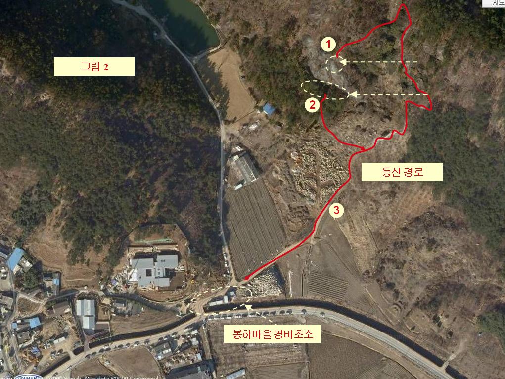 그림 2,3) 은 위에서 내려다본 봉하마을, 부엉이 바위 모습인건데... 이거 잘보면 창고나 주변 집모양이 빗나가게 찍히지 않은 것으로 보아 거의 수직앵글로 봐도 되겠다..