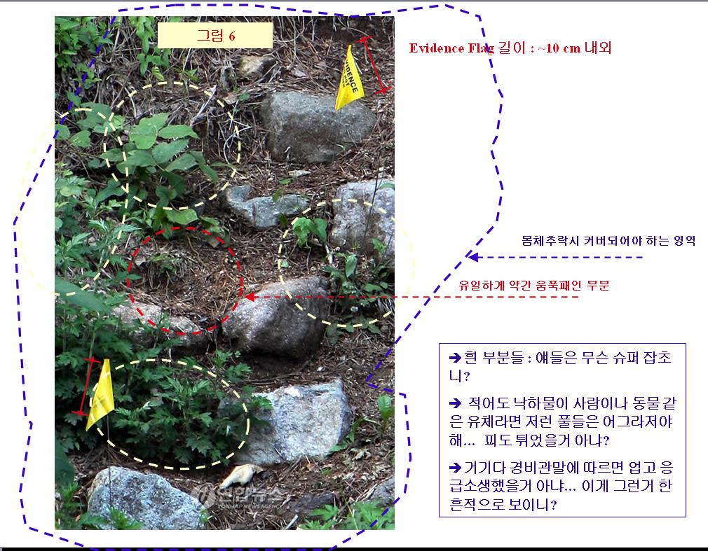 사 람이 시속 100킬로 가까운 속도로 추락했는데, 혈흔이야 이슬이나 잠시 내린 비로 씻겨 내려갔다고 치더라도 저 잡초들은 뭔가? 무슨 지들이 슈퍼잡초냐? 대략 사이즈로 봐라... 이게 추락이란게 그 속도로 떨어지면 단순 골절이 아니라 뇌며, 장이며 다 터진다. 주위에 똑똑한 의사하는 친구나 선배 큰 병원 응급실에서 근무하는 간호사한테 물어봐라... 사람이 퍽 하고 터진다...