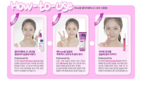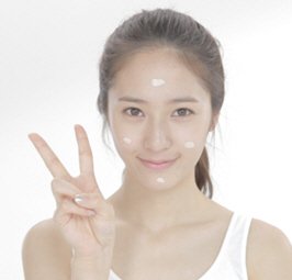 2단계, 수분 공급과 자외선 차단 기능이 있는 BB Sun을 엄지 손가락 만큼 짜 내어 얼굴 전체에 얇게 펴 발라 주세요.