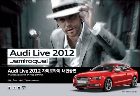 영국이 낳은 가장 스타일리쉬한 밴드, 자미로콰이가 올 8월 두 번째 내한공연을 가진다는 소식 들으셨나요? 자미로콰이는 2008년에도 아우디 라이브 콘서트에 초청되어 열정적인 무대를 가졌었죠~ 저도 그 때 다른 일 다 제치고 자미로콰이를 보기 위해 아우디 라이브를 갔었는데요. 자미로콰이는 이번에도 아우디와 손잡고 아우디 라이브 2012 자미로콰이 콘서트를 연다고 합니다. 자미로콰이가 자동차 매니아라고 하는데.. 그래서 아우디와 두 번이나 함께 하는 걸까요? 암튼 자미로콰이하면 껌뻑 죽는 저기에 이번에도 제이케이 형님을 만나러 가야 할 것 같습니다!