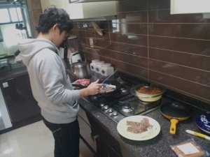 그리고 나선 나보고 가만히 앉아있으라 그러고 고기를 구움