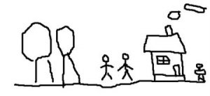 평화로운 집에서 사는 두 부부를 그리는 거야. 예쁜 집에 창문도 있고 굴뚝에서는 연기가 모락모락 피어오르고, 나무랑 화분도 많이 있고... 두 부부의 아름다운 하루를 연기하게.