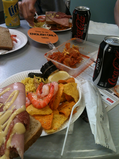 그릇의 음식들 + 베이컨빵 + 과자 + 콜라로 그럭저럭 먹을만 했습니다.