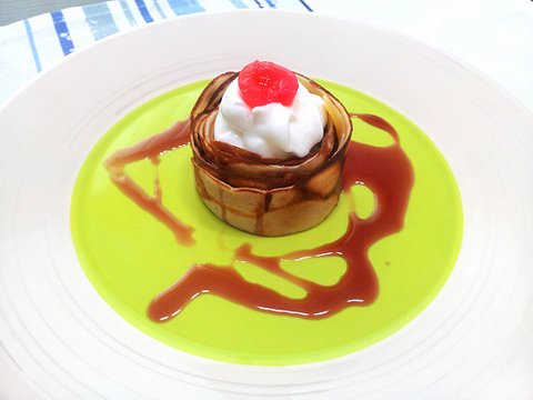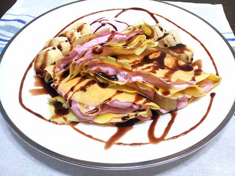 얘도 핫케익 가루로 한거에요. 대신에 일반적인 반죽보다 조금 묽게 해줬어요. 우유로 조절 하시면 되어요. 딸기로 하고 싶었지만 마트에서 팔지 않는 관계로.. 바나나와 딸기 생크림으로 만들었어요.
