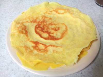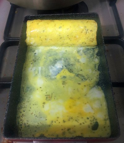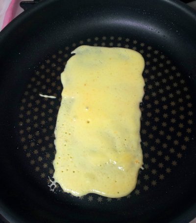 약불에 계란 물을 아주 조금 부어서 얇게 넓혀줘요. 그대로 한번 말고 사진처럼 계란 물을 한번 더 부어서 총 두 번을 말아 줘요.