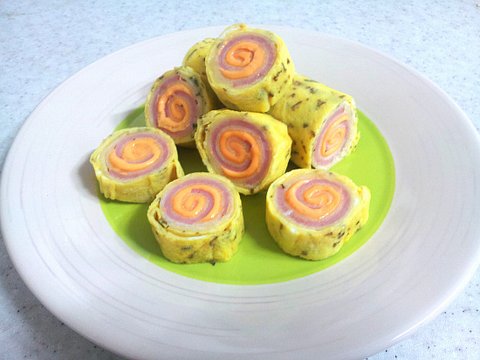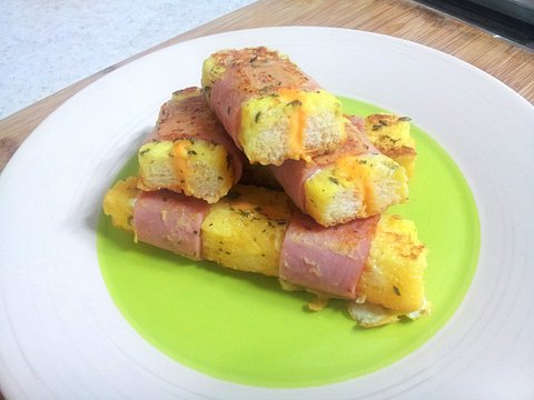 치즈 올리고~ 햄으로 감싸고~ 계란 물 묻혀서 지직 지직.