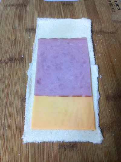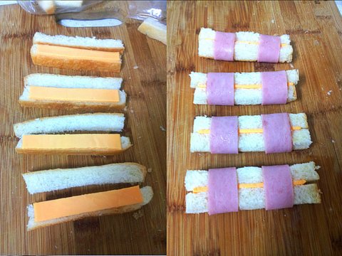 우선 식빵 두 장을 테두리를 잘라 밀대로 밀어주셔요. 식빵은 서로 겹쳐서 밀대로 한번 더 밀어 주셔서 딱! 붙여줘요. 그 다음 사진처럼 치즈랑 햄을 놓고 돌돌~ 말아서 랩에 싸놓으셔요. 단단해져요.
