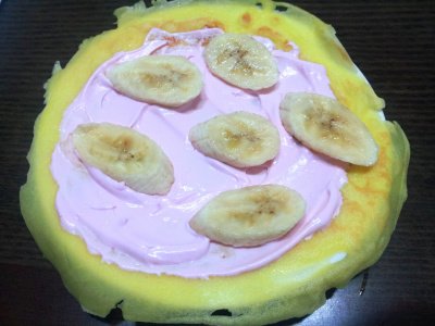 생크림을 바르고 슬라이스한 바나나를 슥슥! 이제 반 접고 반 접은 다음 예쁘게 데코만 하면 되는데.. 대 실패.