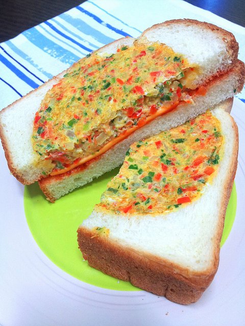 완성된 후라이는 빵 위에~ 반으로 잘라 토마토 등과 함께 먹으면 GOOD~~