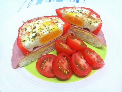 이제 파프리카를 두껍게 썬 다음 그 링 안에 계란을 톡 까넣어요. 계란 물이 세어나올 수 있지만 당황은 하지 않아요. 슬슬 익히면서 소금, 후추, 파슬리 가루를 뿌려 간을 해요.