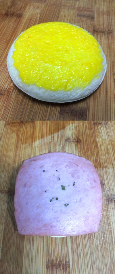 동글빵에 머스타드 소스를 슥 바르고, 샌드위치용 햄을 뜨신 물에 살짝 행궈주고 그 위에 올려요.