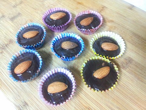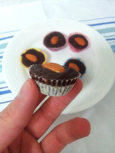 그냥 해봤어요. 화이트 초콜렛과 카카오 초콜렛을 중탕으로 녹여요. 카카오 초콜렛엔 생크림을 섞었어요. 용기에 화이트 초콜렛을 넣고 그 위에 카카오를 올립니다. 아몬드 하나 뿅.