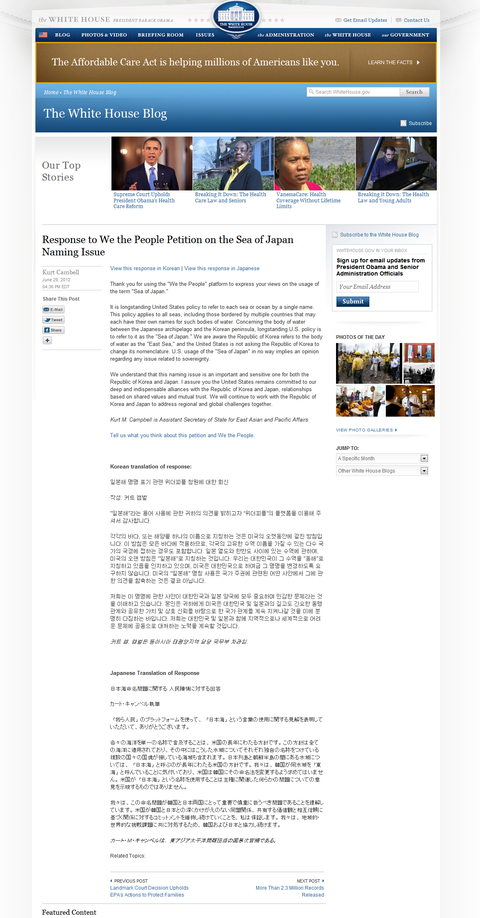 우리는 대한민국이 그 수역을 "동해"로 지칭하고 있음을 인지하고 있으며, 미국은 대한민국으로 하여금 그 명명을 변경하도록 요구하지 않습니다. 미국의 "일본해" 명칭 사용은 국가 주권에 관련된 어떤 사안에서 그에 관한 의견을 함축하는 것은 결코 아닙니다.