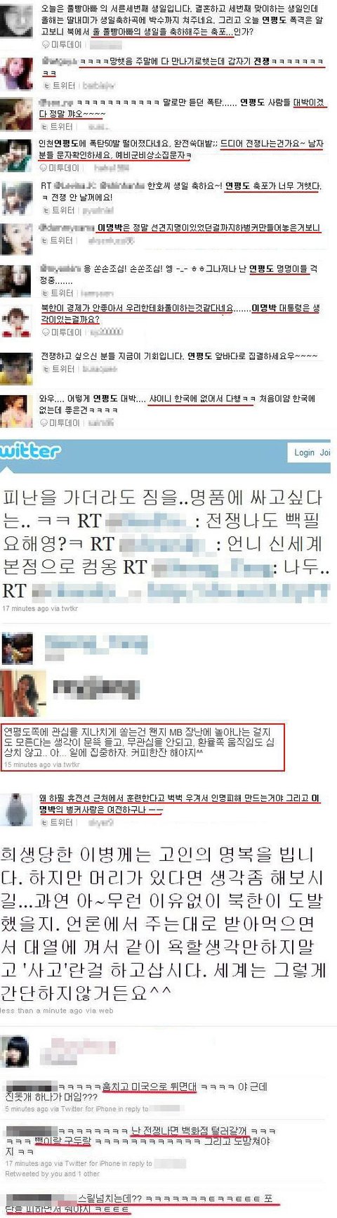 연평도 터졌을 당시 , 저는 병장1호봉 이였습니다 파주에서 정비 근무를 하고있던 저는 연평도사건때문에 백령도로 파견을 가게되었지요, 차타고 배항까지 3시간 30분,배타고 12시간 이동..(큰배였기때문에 엄청 느렸던걸로 기억) 속으로는 " 아 무섭다.. 진짜 전쟁인가? .. 아 부모님한테도 아직전화 못해줬는데.." 하며 엄청 걱정하고... 정말 무서웠었습니다.. 군인도 사람이다보니.. 하지만 한쪽 가슴으론 벅차있었습니다. 내 군생활 2년 동안 이런 사건이 터져 드디어 북한이랑 전쟁을 하여 통일하는 기대감에 벅찼습니다.. 어떻게 보면 애국심이지요.. 힘겹게 백령도에 도착하고 바로 해병부대로 이동하였습니다. 백령도 근무해보신분들은 아시겠지만, 보급이며 부대며 취약한 부분이 많습니다. 저가 갔던 부대는 px조차 없었다는.. 바로 탄약 동굴로 이동하였습니다 거기엔 무수히 많은 군인들과 간부들이 있었습니다. 부대에 있다간 위험하단 판단으로 동굴로 가게된것이지요.. 이곳에서 2박 3일동안 나오지도못하고 전투식량 및 컵라면으로 끼니를 떼우며 지냈습니다. 난생 처음으로 방탄 조끼도 입어보고.. 벗지를못했습니다..밥먹는순간에도... 언제 터질지 모르는 포격 , 전쟁때문이였습니다.... 간부님에게 말했습니다. " 간부님 전화한통만 해도 되겠습니까? " "지금 통화하면 북한에게 도청되 정보를 흐릴수도있다 " 진짜 마음을 굳게 먹었었습니다.. 간부나 병사들은 예민하였고.. 실제 상황이 터질시 실탄을 주는데, 실탄 주기 직전이였습니다.. 해병대 북한 대응 포격 연습을 할시엔 동굴로 피난가고.. 고난의 하루하루였습니다.. 그렇게 한달을 백령도,연평도에서 지원 나간 육군과 해병대님들이 그 고생을하였습니다.. 전국에있는 육군 해군 공군 해병대 근무하신분들 모두다 비상 상태며 힘든 시기를 한달넘게 밥도 재대로 못먹어가며, 걱정하며, 몸고생 맘고생 다했습니다..그때 아마 미군에서 일본으로 항공모함을 보냈다지요.( 항공 모함 한대로 북한 5분만에 전멸 가능 ) 근데.. 이제와서 본거지만.. 트위터에 저런 말을 하다니요.. 여자분들... 남성분들이 정말 화날만합니다.. 특히 그 당시에 군복무 하고계셨던분들은... 아무리 몇몇 여자분들 어리고 개념없고 생각없다지만 저런 말 보면 정말 진짜 화납니다 자기네들은 2년동안 밖에서 누구덕에 편하게 웃으면서 생활하는건데.. 만약 진짜 전쟁나면 사회 계급사회는 바뀌게 됩니다. 1. 군인 2. 경찰 3. 공무원 4. 민간인 만약 통제(명령) 불응시, 그자리에서 실제 사격(사형) 가능 . 알고계십니까? 전쟁나면 군인이 1순위 계열을 갖게되며 명령을 따라야한다는것을... 더이상 민주주의가 되지않는다는겁니다..여자분들..군인들 부대에서 뭐하는지,어떻게 생활하는지도 모르고 그렇게 지네 편하다고 짓거리지말고. 고생한다. 고맙다. 이 한마디들만 해줘도 군인들..정말 힘납니다 이상 입니다