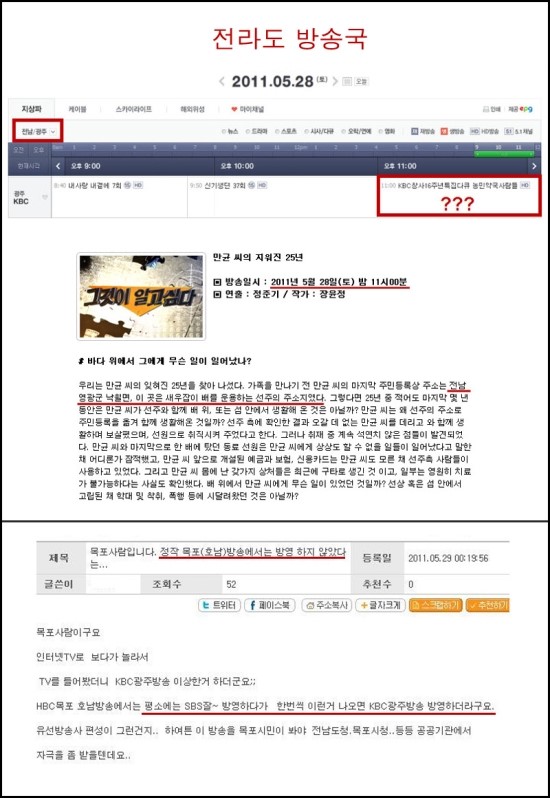 전국에 방송 하지만 전라도 지역은 정규방송 안내보내고 지역방송 내보냄