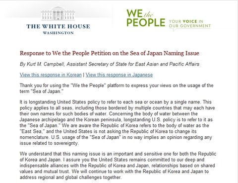 "Petition Response: Response to We the People Petition on the Sea of Japan Naming Issue"(일본해 명명 표기 관련 청원에 대한 응답)