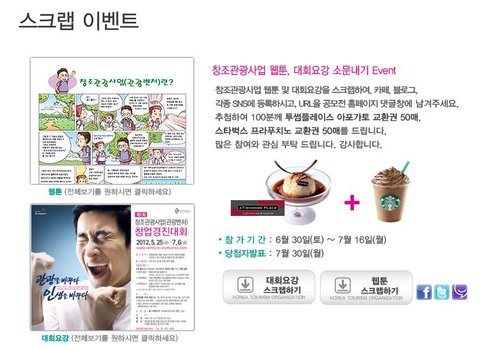 창조관광사업 홈페이지에서는 창업경진대회 소문내기(스크랩) 이벤트를 진행중이고