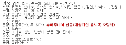 그중 경북문경에 '슈퍼주니어 신동'에 빨간칠로 뭔가 덧붙여 주셨군요.