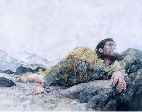 그리고 그는 염소가죽 정강이받이에 풀잎 망토를 입었고 잘 짠 신발을 신었으며