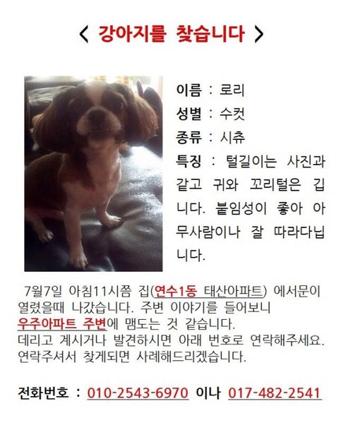 아 그리고 이 글 읽으시는 분들중에 인천경기서울권 님들 이 강아지 보신분들은 꼭 연락주세요