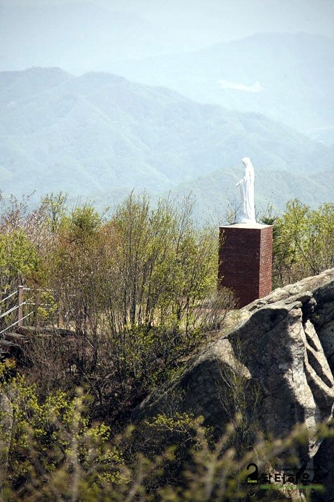 임꺽정이 바라본 풍광을 눈에 담았습니다. 동으로는 동두천의 마차산(588m)·소요산(587m)·왕방산(737m)이 눈에 들어오고, 북동쪽으로는 멀리 철원의 고대산(832m)과 금학산(947m) 등 최전방의 산군이 내려다보입니다. 남쪽으로는 신암저수지의 평화로운 풍경이, 남동쪽 가까이로는 자그마한 산봉우리 위에 서 있는 이색적인 마리아상이 눈에 들어왔습니다. 인자한 표정으로 마을을 내려다보고 있는 마리아상은 감악산을 지키는 군인들을 위해 한 천주교 신자가 세웠다고 합니다.