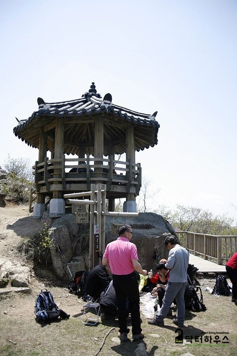 이곳에서 15분 정도 능선을 따르니 정상에 도착했습니다. 감악산 정상은 군부대와 KBS 중계소 등이 철조망에 둘러싸여 있어 임꺽정봉에 비해 정상다운 맛이 덜했습니다. 널찍한 정상을 둘러보니 철조망 앞에 허름한 비석이 눈에 들어옵니다. 설인귀사적비, 비뜰대왕비, 빗돌대왕비, 몰자비(沒字碑) 등 다양한 이름으로 불리는 비석입니다. 오랜 풍화작용 때문인지 글자 하나 남아있지 않은 이 비석에 대해 다양한 해석이 나왔는데, 1982년 동국대 학술조사단의 조사 끝에 ‘신라 고비’로 결론이 났다고 하네요. 널찍한 정상에서 까치봉 이정표를 따라 북서쪽 등산로로 내려서자 널찍한 공터에 세워진 팔각정이 보였습니다. 이곳이 시설물로 가려진 정상보다 오히려 조망이 좋은 포인트입니다. 가족이 함께 오면 이곳에서 식사나 간식을 나누며 쉬어가면 좋습니다. 정자부터는 완만한 하산길이 이어졌습니다. 15분쯤 걸으니 까치봉(540m)에 닿았습니다. 시야가 확 트여 굽이치는 임진강과 민통선 너머 북녘 땅까지 한눈에 볼 수 있는 봉우리입니다. 까치봉에서 15분을 더 걸어가자 쌍소나무봉(440봉)입니다. 직진해 능선을 따라가거나 100m 앞에서 오른쪽 계곡길을 따르면 감악산휴게소로 연결됩니다.