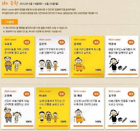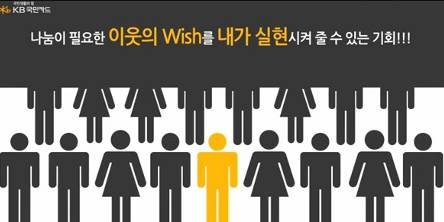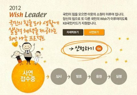 위시리더 프로젝트는 우리의 도움이 필요한 이웃의 Wish를 내가 대신 신청하고 KB국민카드가 그 위시를 실현할 수 있도록 도와주는 전국민 나눔 프로젝트랍니다.^___^ 위시리더 홈페이지 (http://www.wishtogether.co.kr/2012/leader/info.asp)에는 좀 더 자세한 설명이 나와 있어요.ㅎㅎ