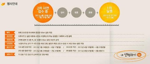 최종 위시 실현자는 1차와 2차에 나눠 각 8명씩~ 총 16명의 실현자를 선정한다고 해요. 6월에 진행됐던 1차는 벌써 8명의 후보자 선정과 함께 위시리더 응원까지 모두 끝난 상태더라구요. 6월 27일부터는 순차적으로 위시 실현 현장스케치가 홈페이지에 소개된다고 하니 잊지 말고 꼭 확인해야겠어요. ^^ 1차가 끝났다고 서운해 하지 마세요~ 6월 29일부터 7월 31일까지는 2차 사연응모 기간이랍니다. 1차와는 달리 응모 기간이 길어서 좀 더 많은 분이 사연을 응모할 수 있겠네요. >_< 1차 사연 응모를 놓쳤던 저도 신청해보려구요.