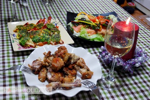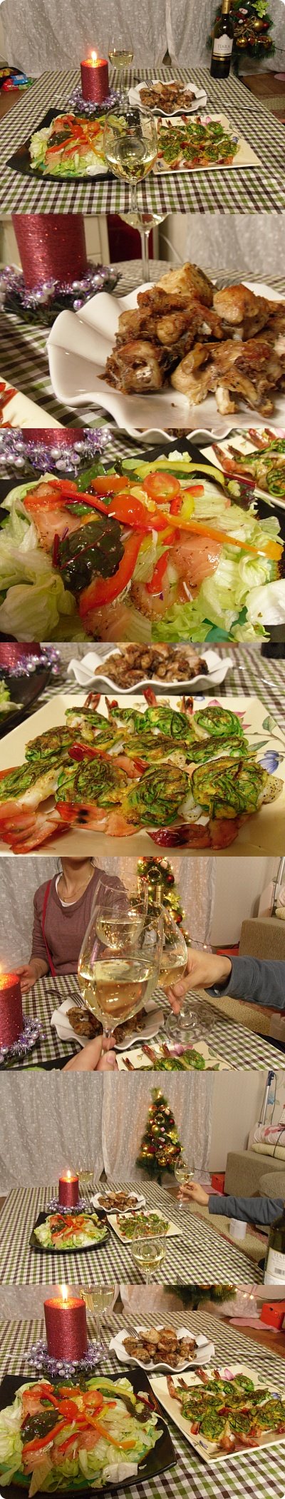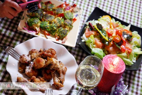크리스마스 파티 상차림 (연어샐러드, 새우호박전, 후라이드 치킨)