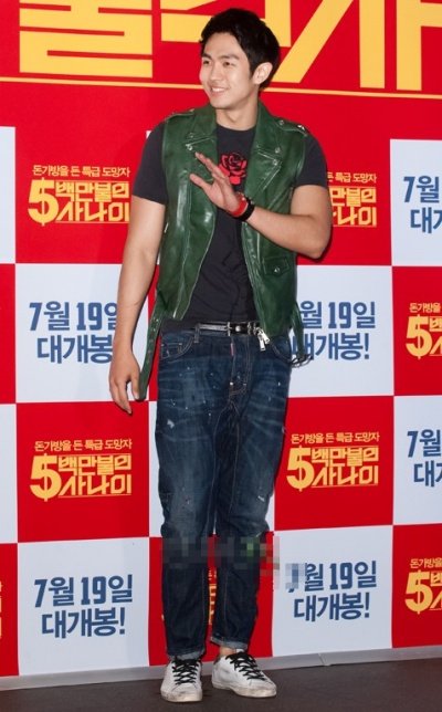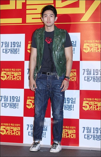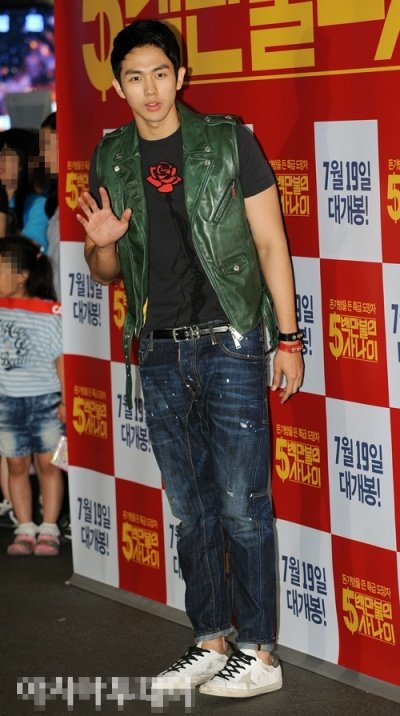 꼬질꼬질한 신발에.... 색 조합 하나도 안되는 티셔츠와 초록 가죽 조끼;;;
