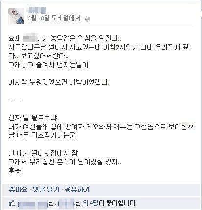 '집에 왔는데 딴 여자랑 누워있었으면 대박이었겠다'
