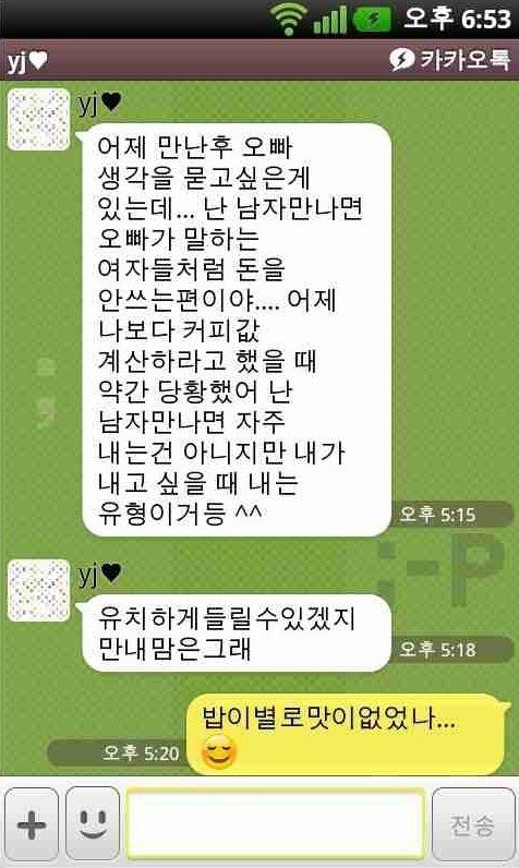 일명 소개팅후 카톡 인데여 여자들은 대부분 데이트후 비용은 남자가 계속 한다고 생각 합니다