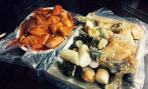 포장마차에 떡볶이와 튀김 오뎅 국물을 시켜놓고
